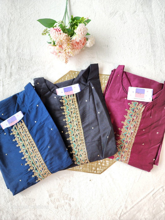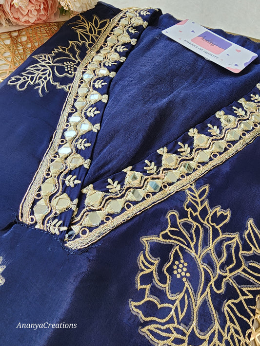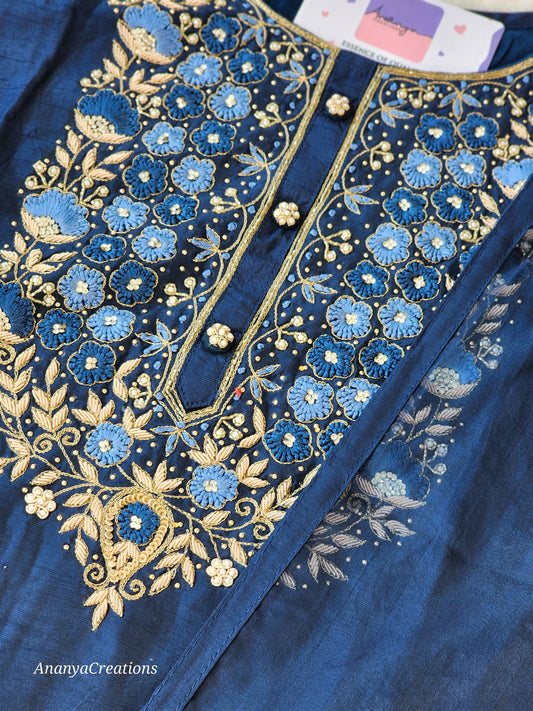DEEP BLUE NECK WORK DOLA SILK SUIT