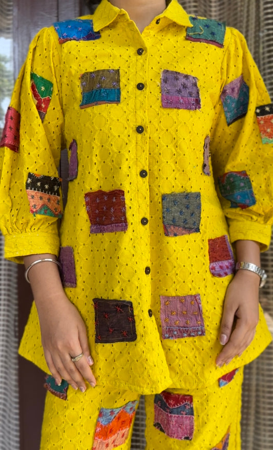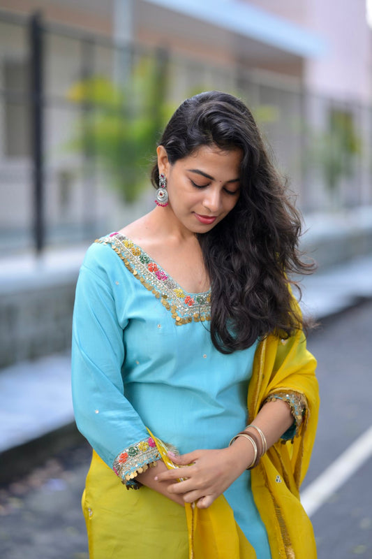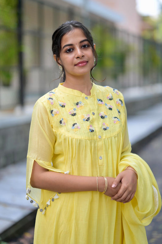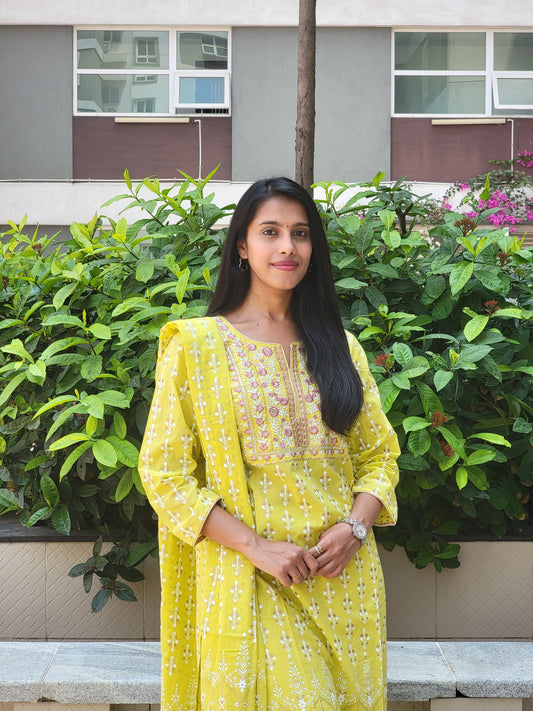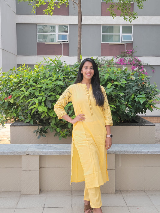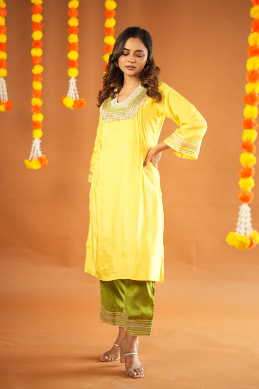 YELLOW & GREEN GLASS NECKLINE KURTA SET