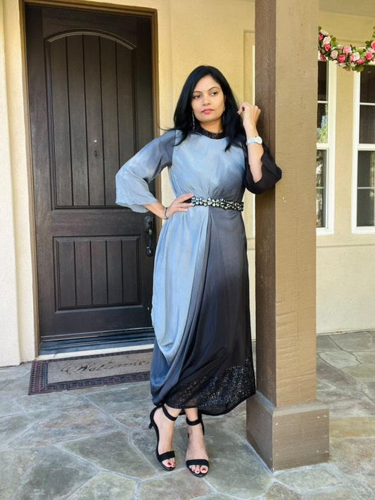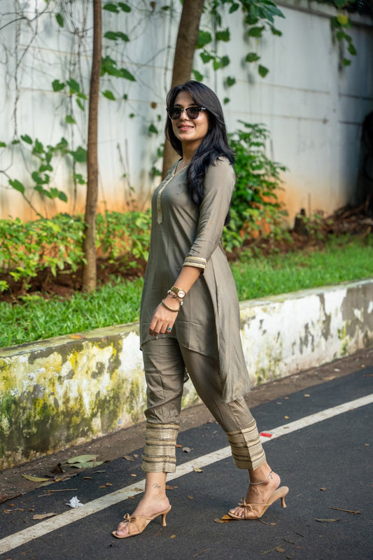 METALLIC TAUPE SHIMMER SUIT WITH POTLI BAG