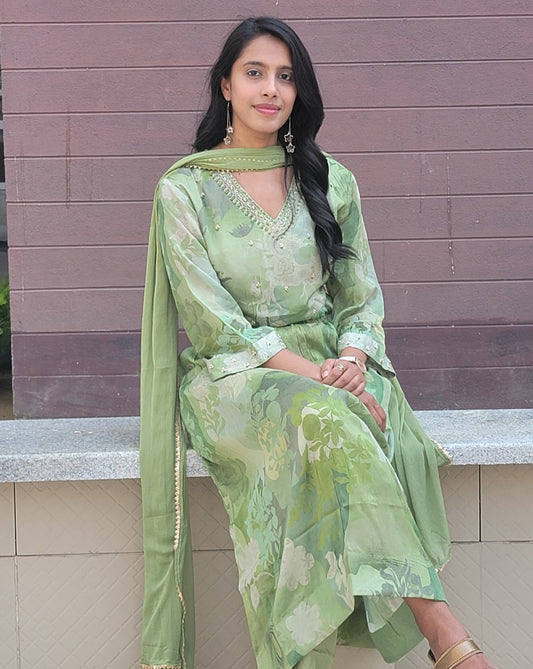 YELLOW & GREEN GLASS NECKLINE KURTA SET